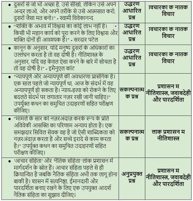 - नीतिशास्त्र के पेपर में विचारकों के उद्धरणों का उपयोग एक आवर्ती प्रवृत्ति है। उद्धरणों की व्याख्या करने और उन्हें लोक प्रशासन एवं प्रशासन से जोड़ने की क्षमता विकसित करें। उद्धरणों को सिविल सेवकों द्वारा सामना की जाने वाली वास्तविक दुनिया की चुनौतियों से जोड़कर ऐसे प्रश्नों के उत्तर देने का अभ्यास करें।