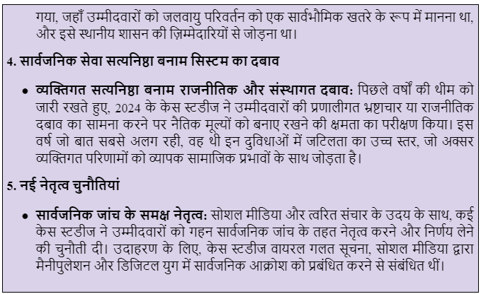 - दबाव में नेतृत्व: कई केस स्टडीज़ उम्मीदवारों को संकट की स्थितियों में अपने नेतृत्व कौशल का प्रदर्शन करने के लिए चुनौती देती हैं- चाहे वह आपदा प्रबंधन हो, सार्वजनिक विरोध प्रदर्शन हो या सामुदायिक तनाव को संभालना हो। यहाँ ध्यान इस बात पर है कि एक नेता सभी हितधारकों के कल्याण को ध्यान में रखते हुए कितना निर्णायक और नैतिक रूप से कार्य कर सकता है।