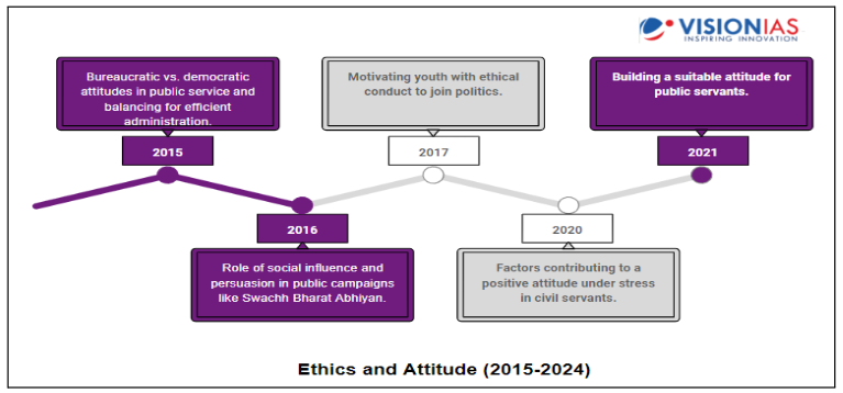 UPSC मुख्य परीक्षा के लिए 2015 से 2024 तक के एथिक्स पेपर (GS-IV) में लगातार एक थीम आधारित पैटर्न का पता चलता है, जिसमें प्रमुख नैतिक क्षेत्रों पर बल दिया गया है। नीचे उन आवर्ती विषयों का विस्तृत विवरण दिया गया है जिनसे पिछले कुछ वर्षों में थ्योरी सेक्शन से लगातार प्रश्न पूछे गए हैं: