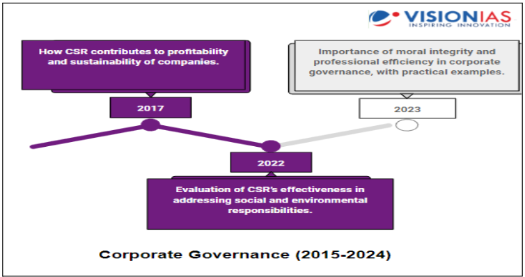 हालाँकि इस टॉपिक पर कम ही प्रश्न पूछे गए हैं, लेकिन कॉर्पोरेट प्रशासन से संबंधित प्रश्न कॉर्पोरेट सेटिंग्स में नैतिक मानकों को बनाए रखने पर केंद्रित होते हैं। यहाँ पर फोकस निगमों की जवाबदेही, कॉर्पोरेट सामाजिक जिम्मेदारी (CSR) और व्यावसायिक प्रथाओं में नीतिशास्त्र की भूमिका पर रहता है।