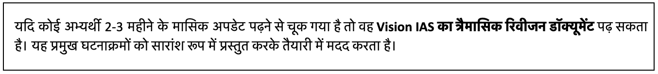 - मौजूदा घटनाक्रमों से अवगत और अपडेट रहने के लिए न्यूज पेपर पढ़ें। दैनिक घटनाक्रमों से संक्षिप्त रूप में अवगत रहने के लिए आप Vision IAS के “न्यूज़ टुडे” डॉक्यूमेंट को पढ़ें।
