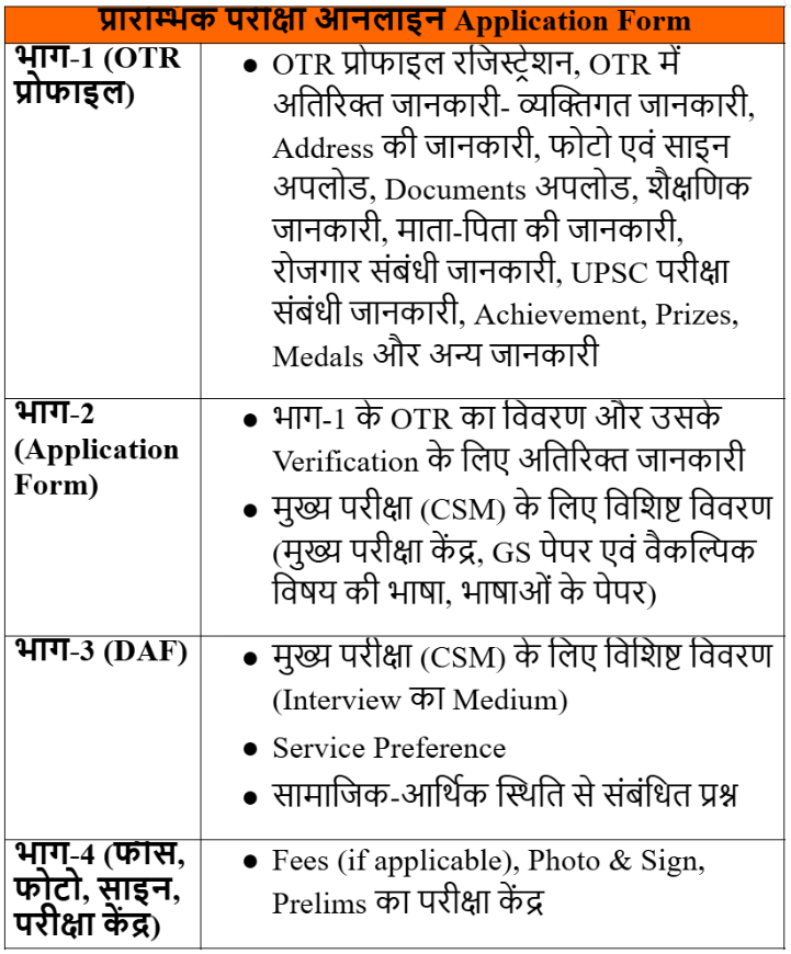 UPSC CSE 2025 अधिसूचना में सबसे महत्वपूर्ण परिवर्तनों में से एक आवेदन प्रक्रिया का पुनर्गठन है। पहले DAF-I (प्रारंभिक परीक्षा के बाद) और DAF-II (मुख्य परीक्षा के बाद) में जमा किए जाने वाली जानकारी और दस्तावेज़ों को अब आंशिक रूप से प्रारंभिक परीक्षा के आवेदन फॉर्म में शामिल कर दिया गया है। अब, प्रारंभिक परीक्षा का ऑनलाइन आवेदन फॉर्म निम्नलिखित चार भागों में विभाजित है-