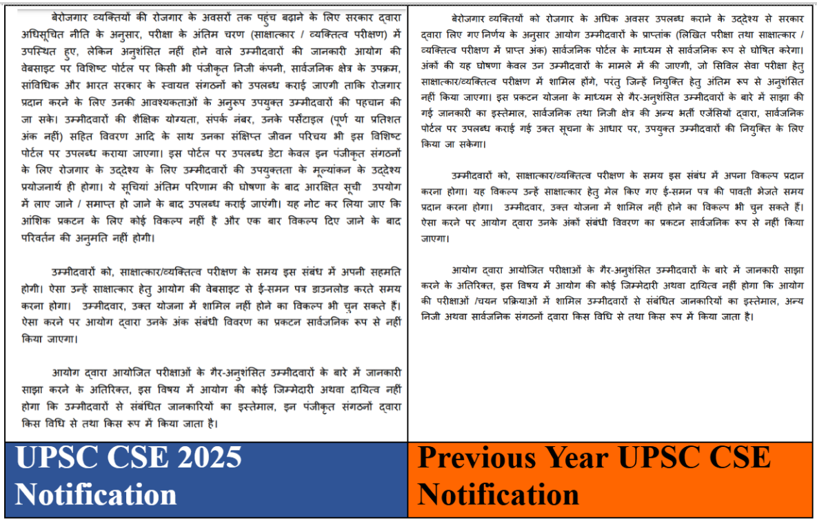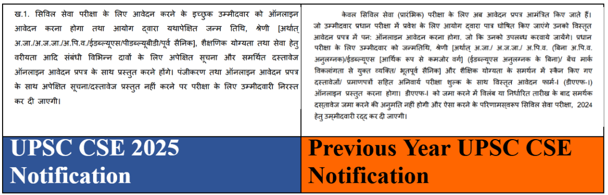 UPSC CSE 2025 अधिसूचना में आवेदन प्रक्रिया को सुव्यवस्थित करने और पारदर्शिता बढ़ाने के उद्देश्य से कई परिवर्तन किए गए हैं। अभ्यर्थियों को आवेदन करते समय त्रुटियों से बचने के लिए इन परिवर्तनों को ध्यानपूर्वक पढ़ना और समझना चाहिए। लगभग 979 Vacancies के साथ, प्रतिस्पर्धा अत्यधिक होगी, जिसके लिए अच्छी तैयारी की आवश्यकता होगी।