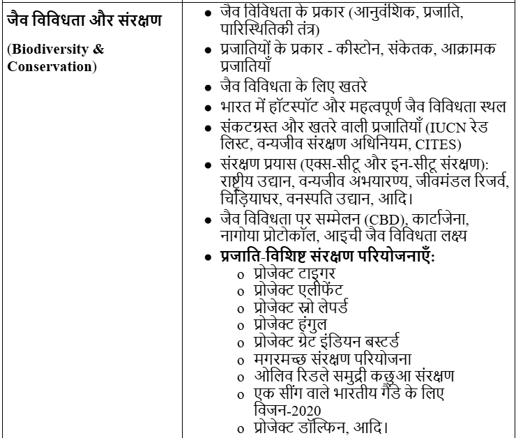 वनीकरण, वन्यजीव संरक्षण और सतत विकास लक्ष्य जैसे टॉपिक्स से अक्सर प्रश्न पूछे जाते हैं। प्रोजेक्ट टाइगर, प्रोजेक्ट एलीफेंट और जैव विविधता अधिनियम जैसी नीतियाँ आवर्ती विषय हैं। विभिन्न प्रजातियों के व्यवहार संबंधी पहलू जैसे उनका पर्यावास, खान-पान, सुरक्षा तंत्र आदि परीक्षा के प्रमुख थीम में से एक हैं।