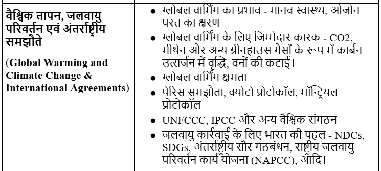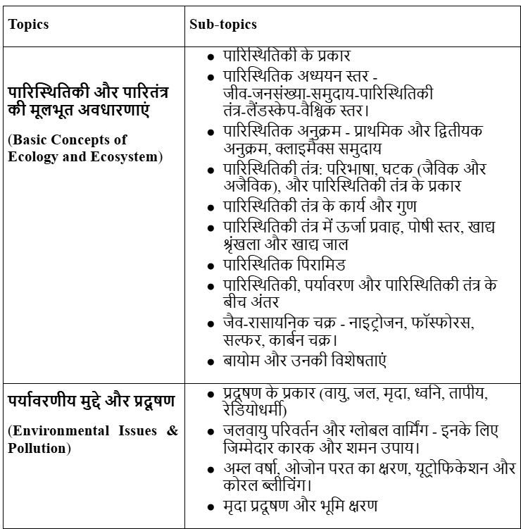 UPSC प्रारंभिक परीक्षा के पाठ्यक्रम में पर्यावरण एवं पारिस्थितिकी को स्पष्ट रूप से परिभाषित नहीं किया गया है; हालांकि, इसे ‘पर्यावरण पारिस्थितिकी, जैव-विविधता और जलवायु परिवर्तन पर सामान्य मुद्दे – जिनके लिए विषय विशेषज्ञता की आवश्यकता नहीं है’ के तहत व्यापक रूप से शामिल किया गया है। लेकिन पिछले वर्षों के प्रश्न पत्रों और उनके विश्लेषण के आधार पर, इन टॉपिक्स को निम्नलिखित रूप में विस्तार से समझा जा सकता है: