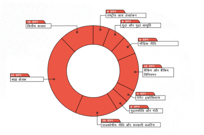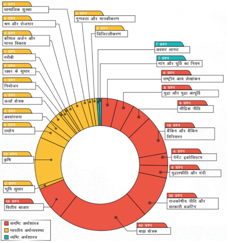 - विगत 10 वर्षों (2015-2024) में पूछे गए 70 प्रतिशत प्रश्न समष्टि अर्थशास्त्र या मैक्रो-इकोनॉमिक्स सेक्शन (NCERT वर्गीकरण के अनुसार) से थे, जिसमें बाह्य क्षेत्रक, मुद्रा आपूर्ति और बैंकिंग सेक्शन शामिल थे।
