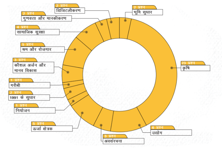 - भारतीय अर्थव्यवस्था (NCERT वर्गीकरण के अनुसार) से संबंधित प्रश्नों की संख्या भी समान रूप से अधिक रही हैं। अभी तक अधिकतर प्रश्न भारतीय कृषि से ही पूछे जाते रहे हैं। हालांकि, 2021 और 2022 में पूछे गए प्रश्नों को इसके अपवाद के रूप में लिया जा सकता है, क्योंकि इन दो वर्षों में भारतीय कृषि पर आधारित अर्थशास्त्र का कोई प्रश्न नहीं पूछा गया था।