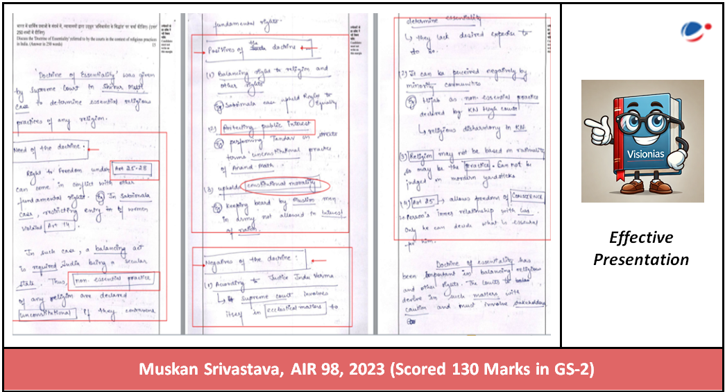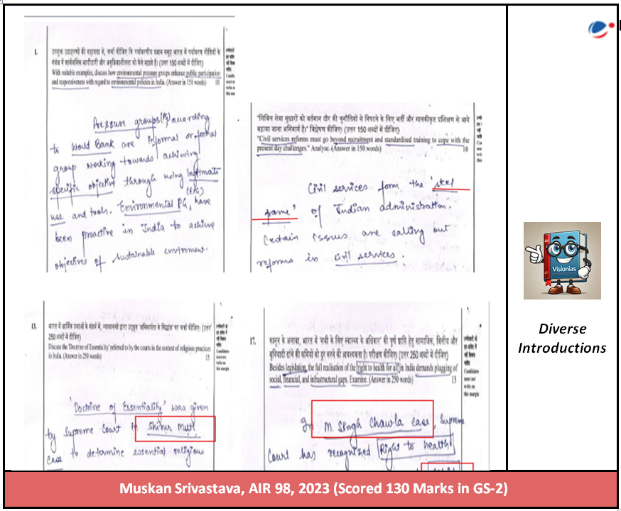 Muskan Srivastava, securing AIR-98 in UPSC CSE 2023 with an impressive 130 marks in GS Paper-II, showcased exceptional skill in crafting structured, clear, and analytically deep answers. Her responses reflect a precise blend of concise articulation, comprehensive coverage, and strategic presentation.