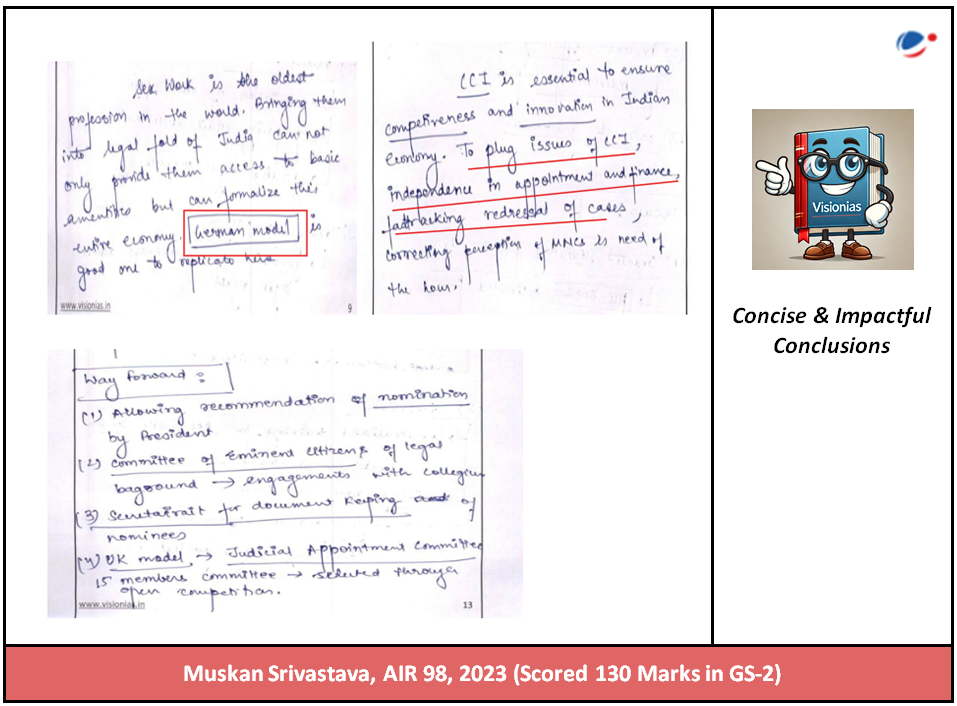 Muskan’s conclusions are concise and straightforward, often citing committee recommendations, best practices, and solution-oriented way forward. This approach ensures her answers end with clarity, relevance, and purpose.