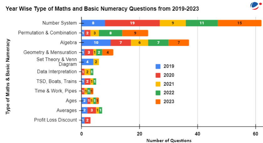 In the Maths & Basic Numeracy section of the CSAT from 2019 to 2023, the Number System has emerged as a consistent focal point, demonstrating its significant role in the paper. Alongside, Algebra and Permutation & Combination have been regular features, with the latter gaining more prominence in recent examinations.