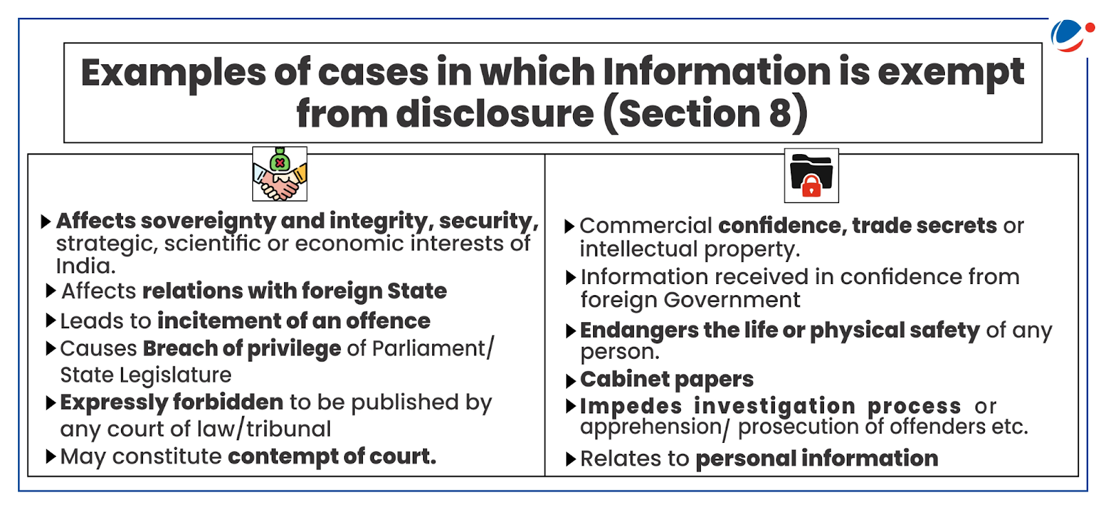 Ans. Section 8 of the RTI Act, 2005 lists exemptions from disclosure. It restricts access to information affecting national security, foreign relations, commercial interests, investigations, cabinet papers, or personal privacy. However, under Section 8(2), information must be disclosed if public interest outweighs the harm of withholding it.