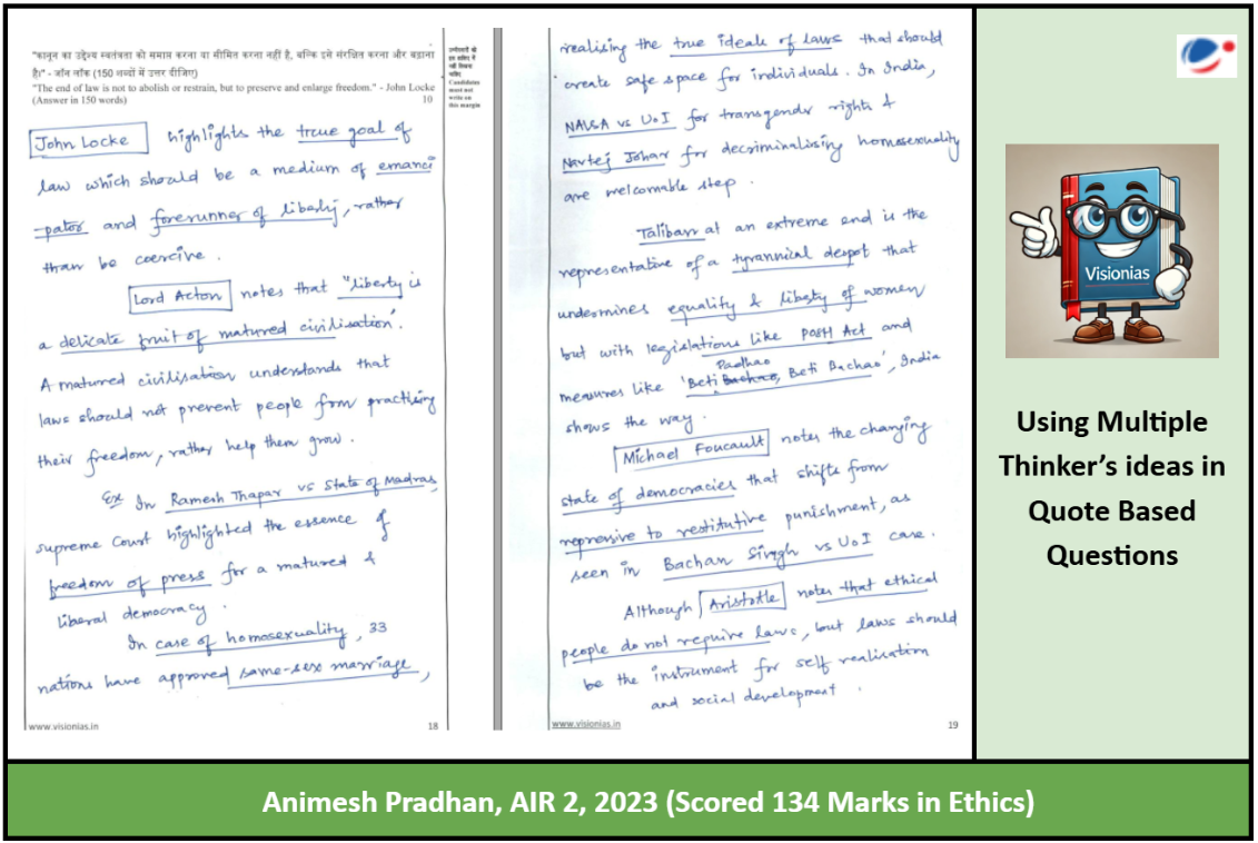 - What it Means: In quote-based questions, Animesh skillfully incorporates the ideas of various thinkers to add depth to his answers and explain his perspective on ethics.