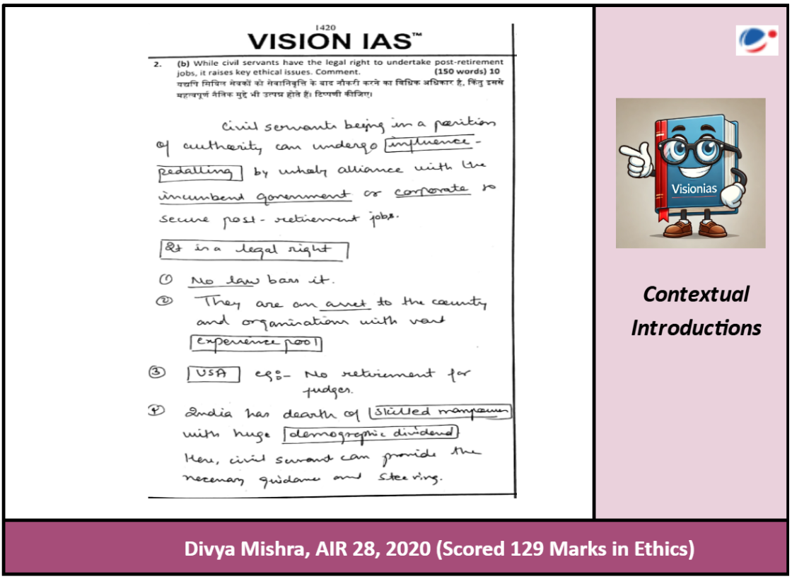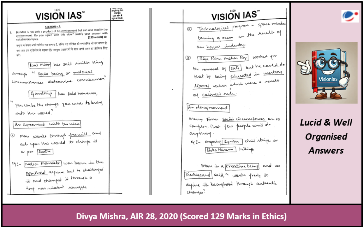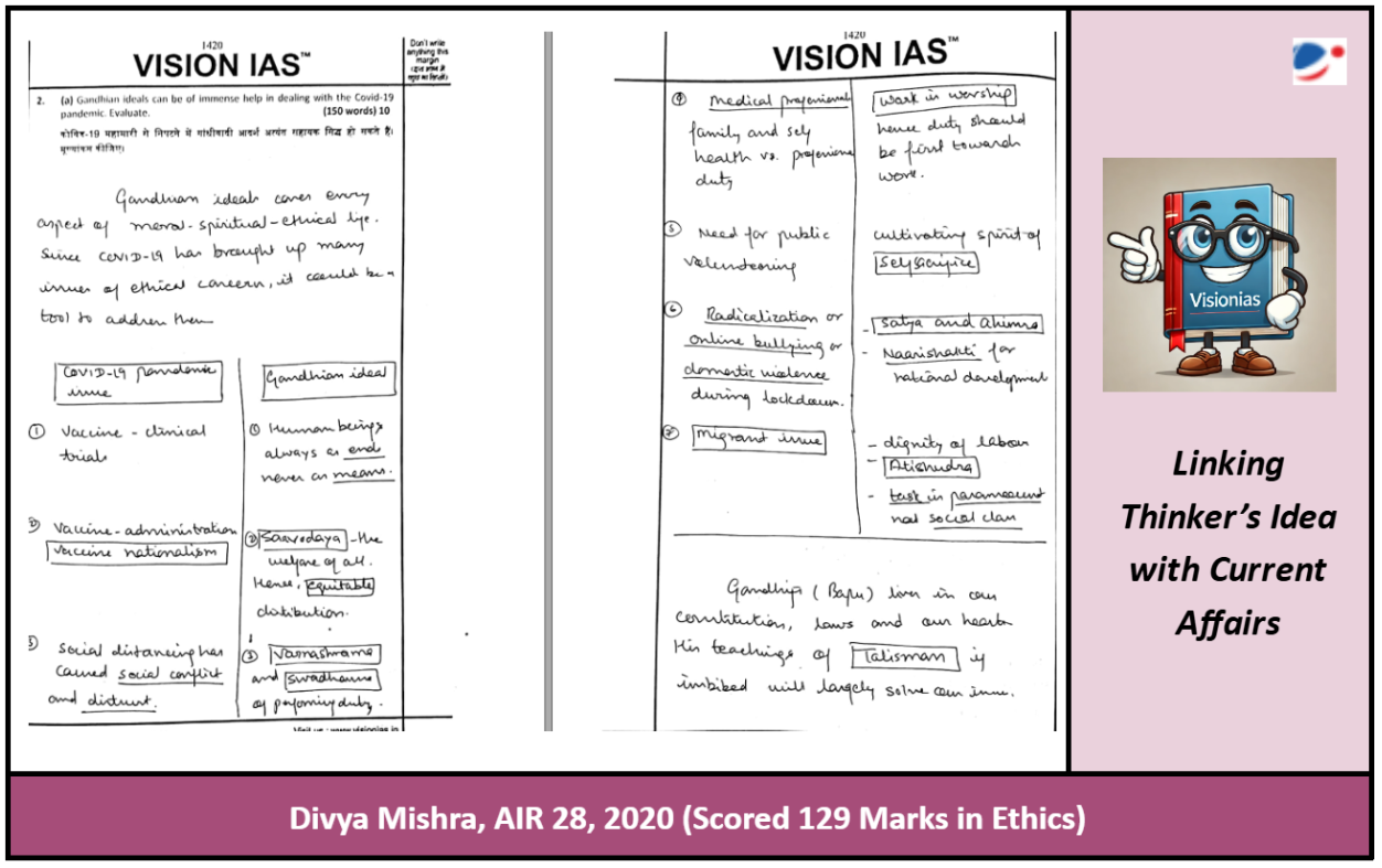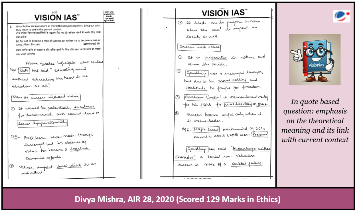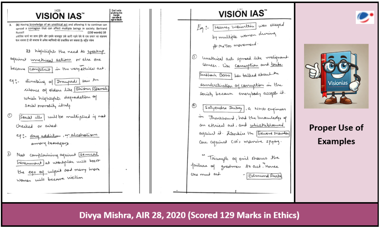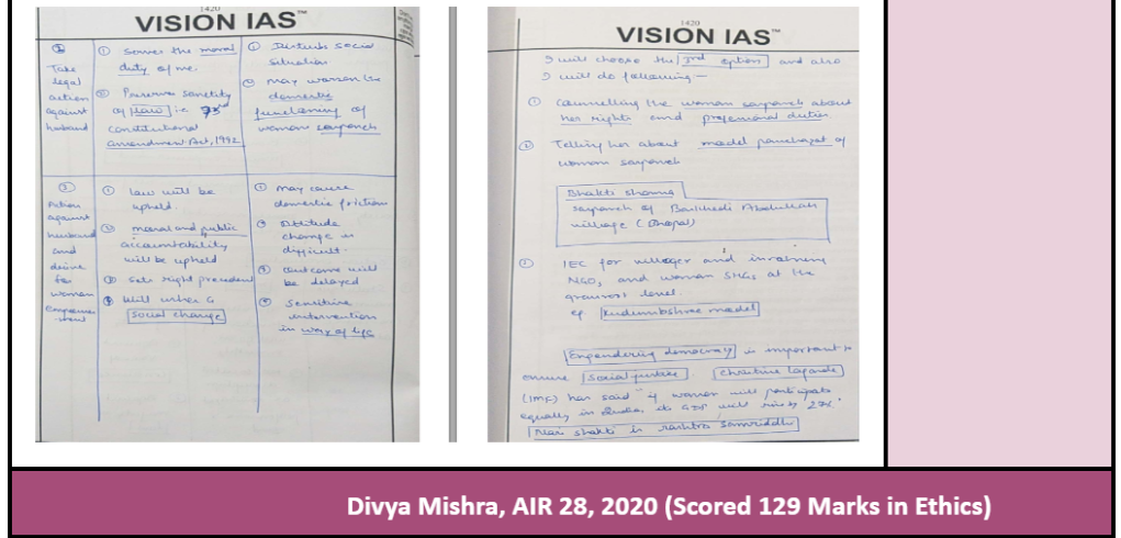 Divya Mishra, AIR-28 in UPSC 2020, mastered this craft with finesse. Scoring an impressive 129 marks in Ethics (one of highest marks in UPSC 2020), she demonstrated how clarity, structured reasoning, and practical examples can turn an ordinary answer into a high-scoring one. Her approach was not about writing lengthy theoretical explanations but about making her answers relevant, precise, and solution-oriented.