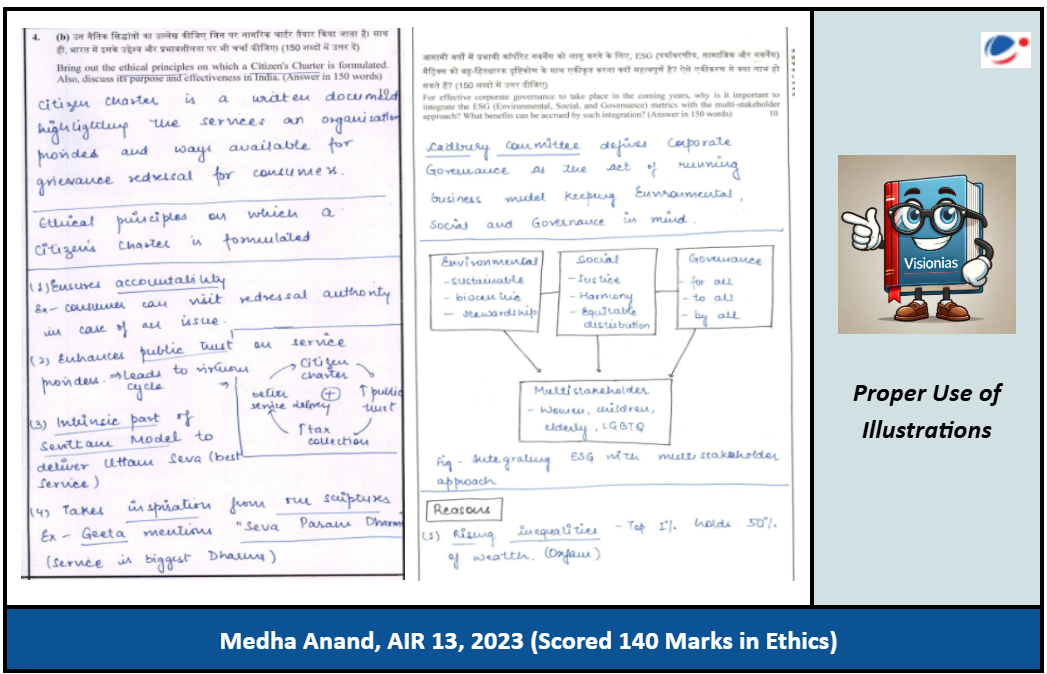For instance, in answer to a question on Citizens’ Charter and its ethical principles, Medha incorporates a neat illustration of virtuous cycle and in another question on corporate Governance uses a schematic of ESG’s multistakeholder approach.