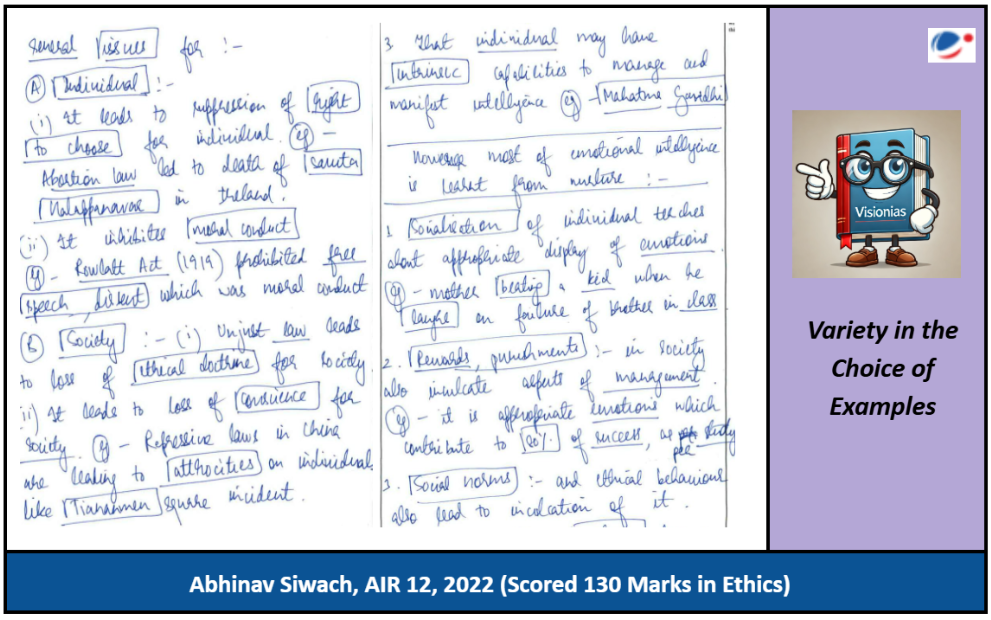 One of the highlights of Abhinav’s answer writing is the diversity of examples he incorporates. Instead of relying on the same set of overused examples, he brings variety by using historical, contemporary events, personal, and public-life examples. This makes his answers engaging and reflective of a well-rounded perspective.