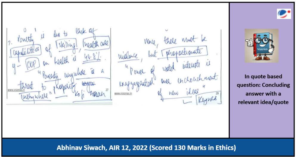Abhinav follows a unique approach in concluding his quote-based answers—he ends them with another insightful quote, ethical principle, or a thought-provoking idea. This ensures that the answer leaves a lasting impact on the examiner. It also helps tie the response together in a more holistic manner.