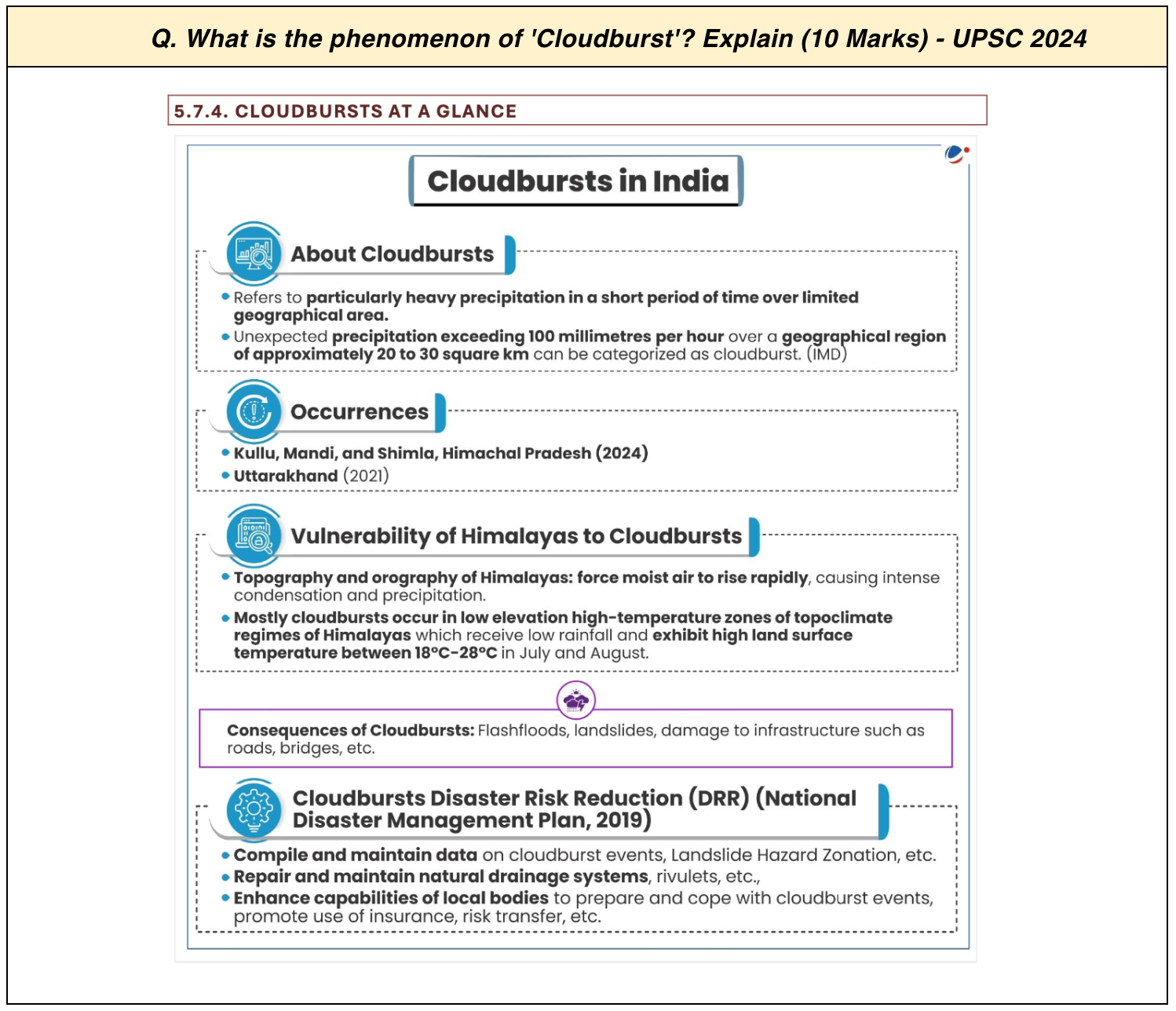 - The phenomenon of cloudbursts, which can lead to sudden and intense rainfall, is succinctly explained in the article Cloudburst at a Glance from Mains 365, providing an overview of their occurrences and impacts.
