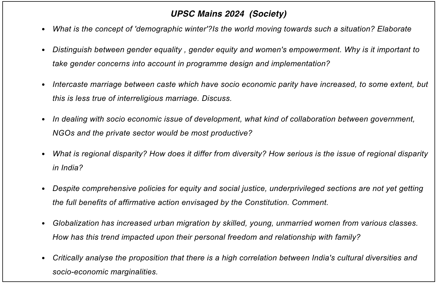 - Concept-Based vs. Application-Based: The 2024 questions are more conceptual, focusing on theoretical topics like demographic winter and regional disparity. In contrast, 2023 and 2022 are more application-oriented, with practical issues like marriage, urbanization, and work-from-home affecting societal dynamics.
