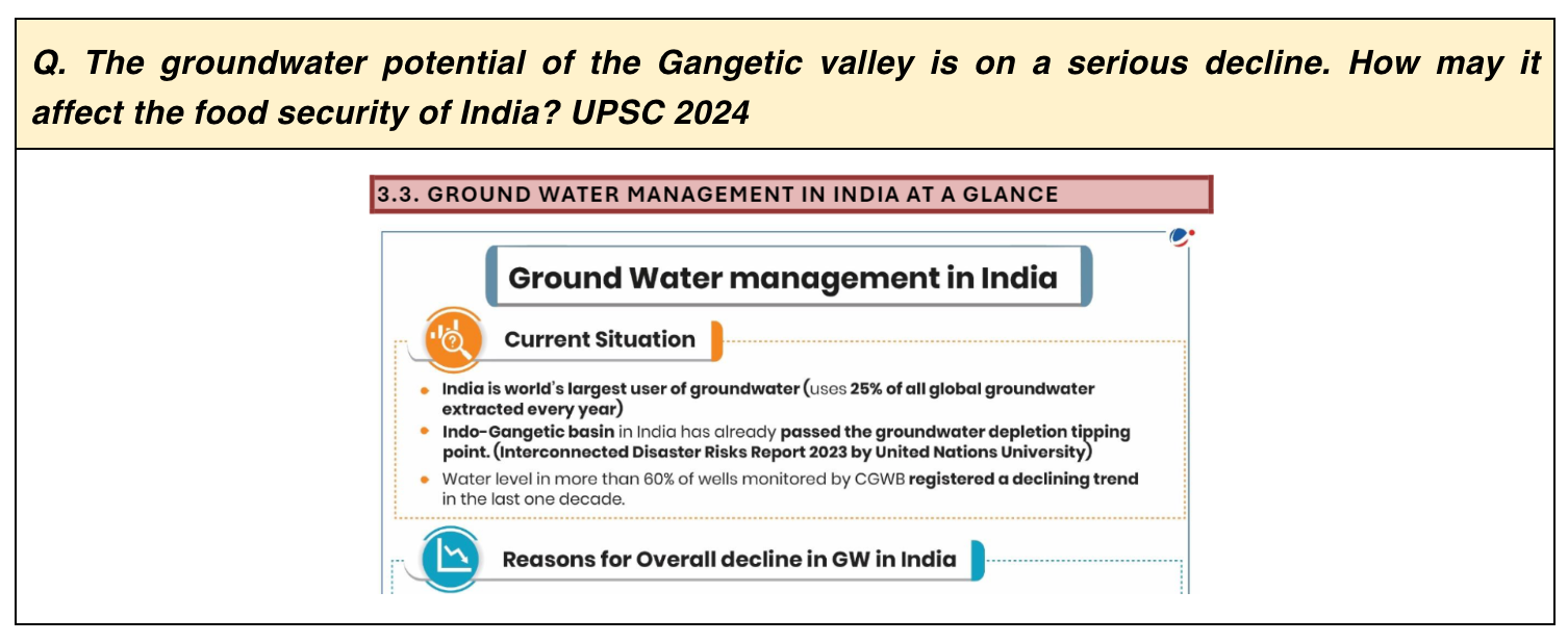 - Groundwater management in India at a Glance from Mains 365 and a News Today article highlight the critical state of groundwater levels and its implications for India’s food security.