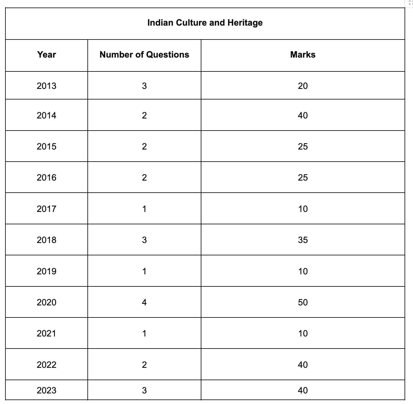 Following is an overall break-up of the number of questions and marks for Indian Culture and Heritage section: