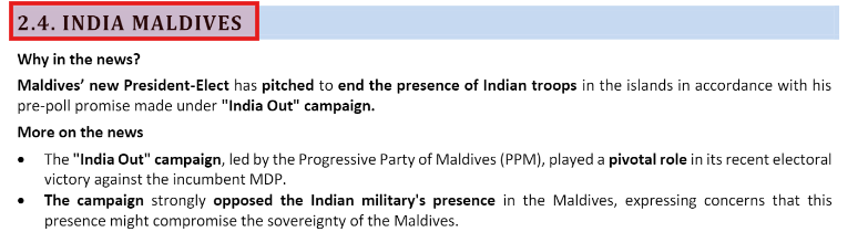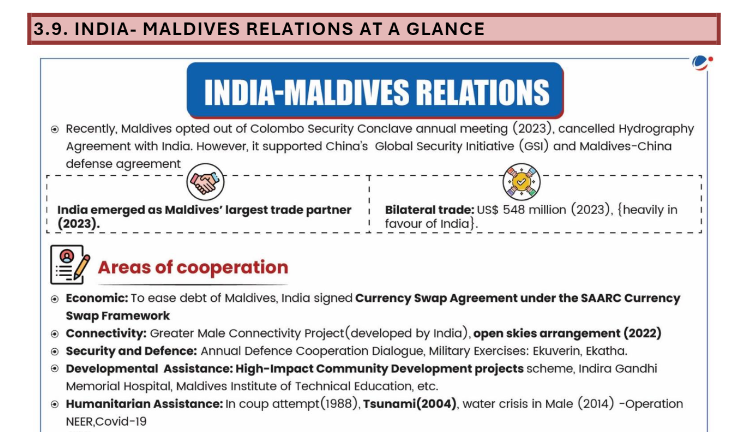 This question requires a comprehensive analysis of India-Maldives relations, synthesizing information from various sources and time periods. For a thorough understanding of India-Maldives relations, refer to the Mains 365: International Relations section on India-Maldives relations. For recent developments, consult the Monthly Magazine article on India-Maldives and the News Today updates on the Indian External Affairs Minister’s visit to Maldives and Maldives signing a military pact with China.