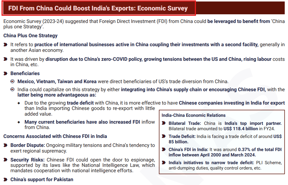 This question requires familiarity with the evolving geopolitical dynamics and India’s role as an alternative to China in global supply chains. Refer to the VisionIAS resources on India and Global Value Chains (GVCs) and the Economic Survey’s insights on FDI from China boosting India’s exports.