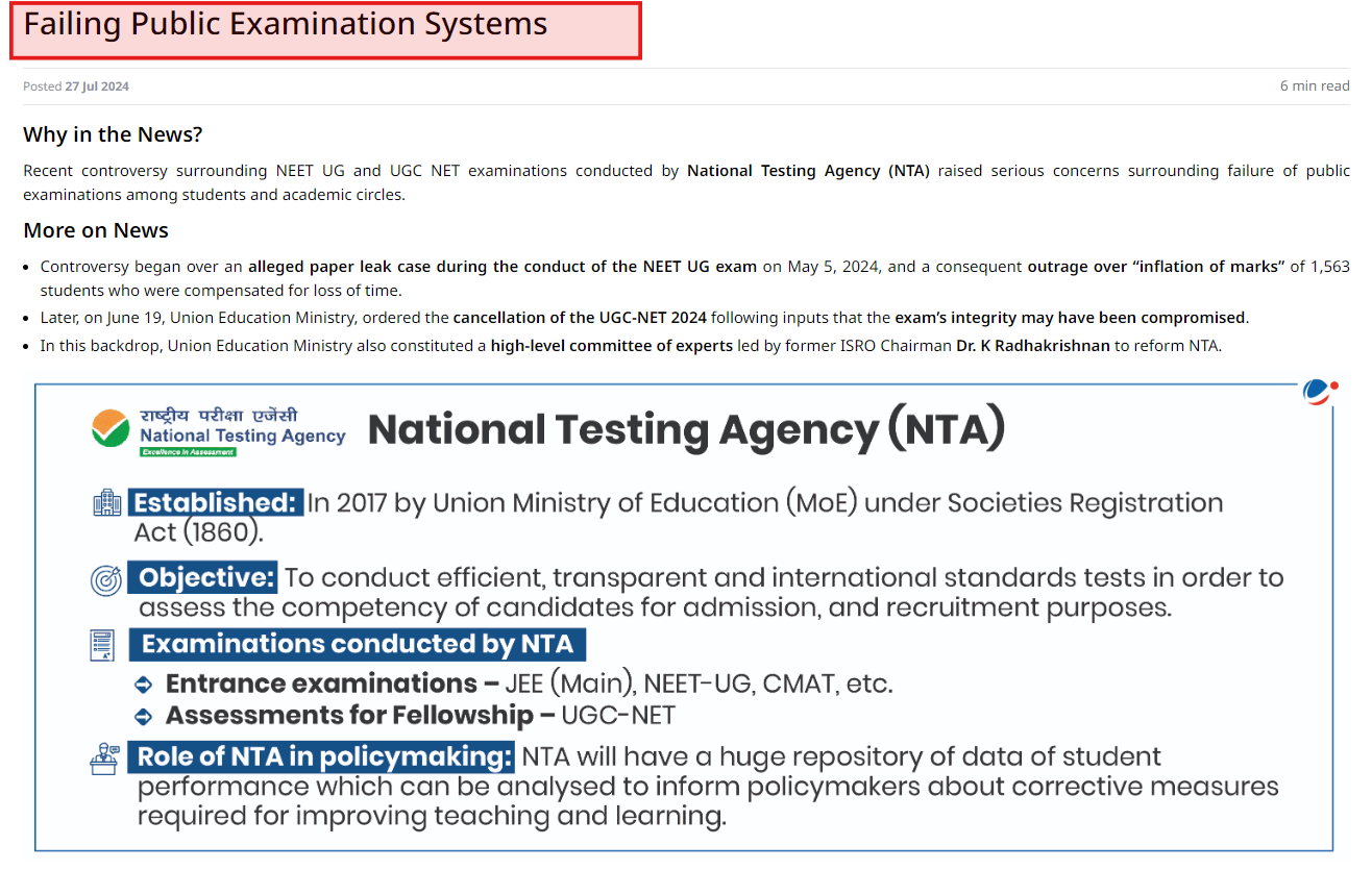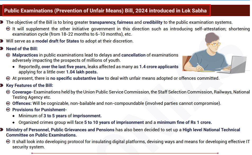 This question provides an opportunity to demonstrate your familiarity with the recently introduced Public Examinations (Prevention of Unfair Means) Act, 2024 mentioned in the News Today and Monthly article in a comprehensive manner while explaining its implications for various board and university exams. For a broader perspective on the challenges in the education system, refer to the Failing Public Examination Systems article in the Updated Mains 365 Classroom Study Material.