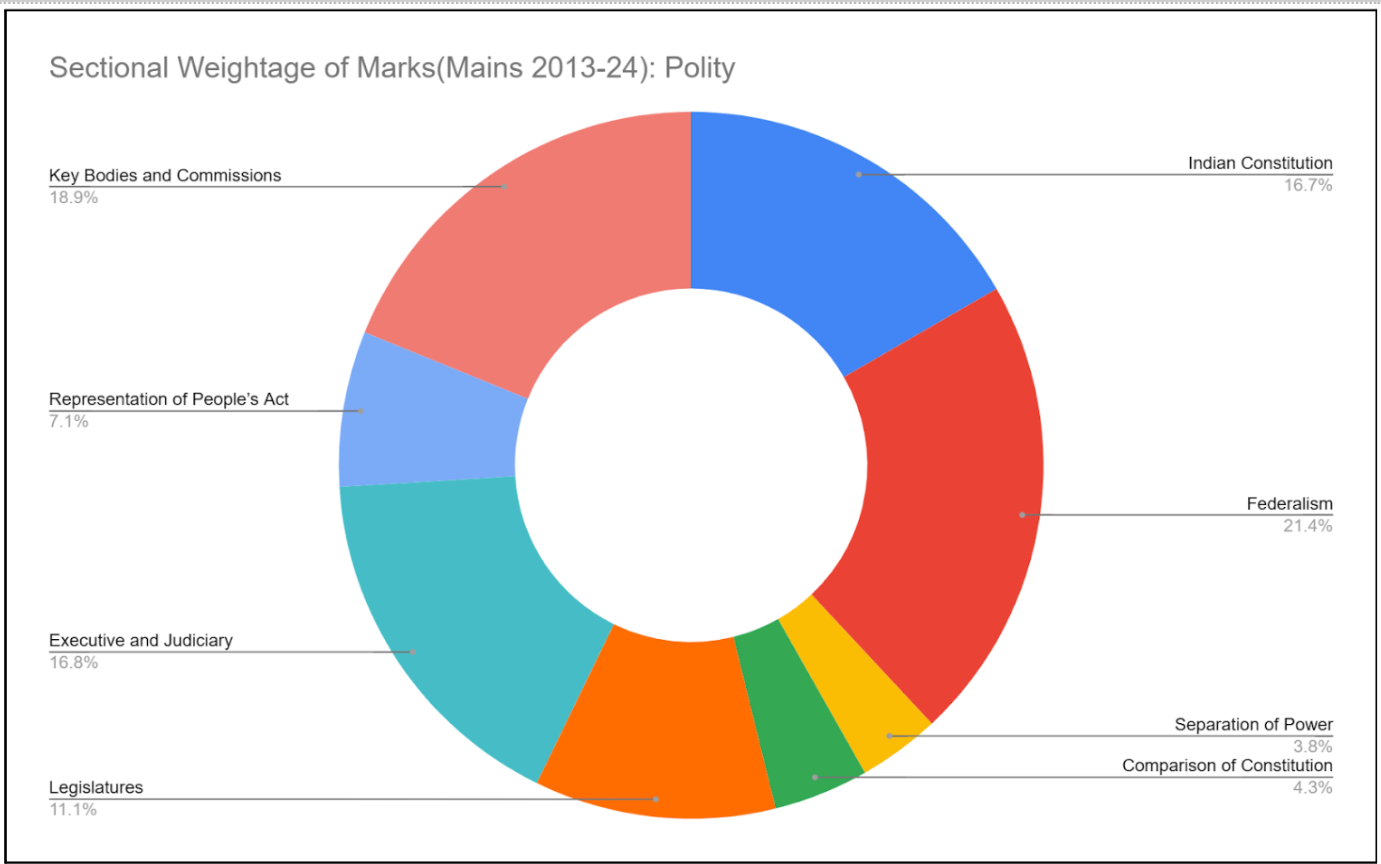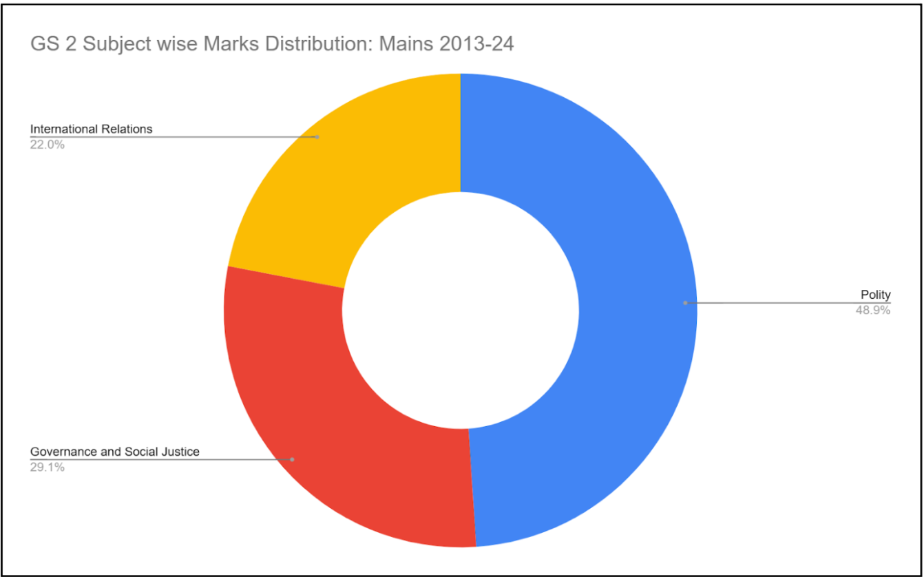 We can club the GS Paper 2 in broadly three main subjects: Polity, Governance and Social Justice, and International Relations. An analysis of the questions asked by UPSC in the Mains examination from 2013-2024 shows the following trend: