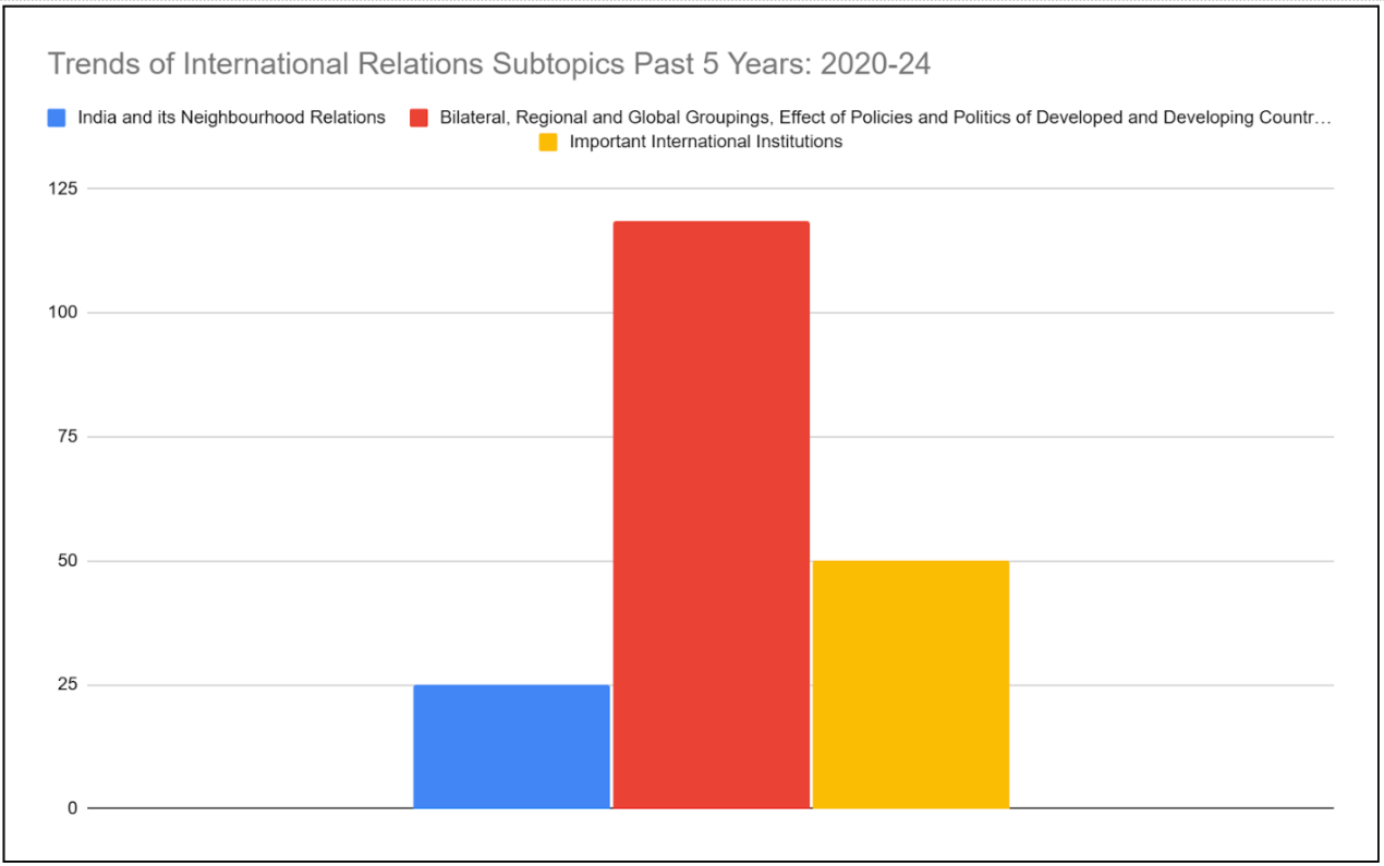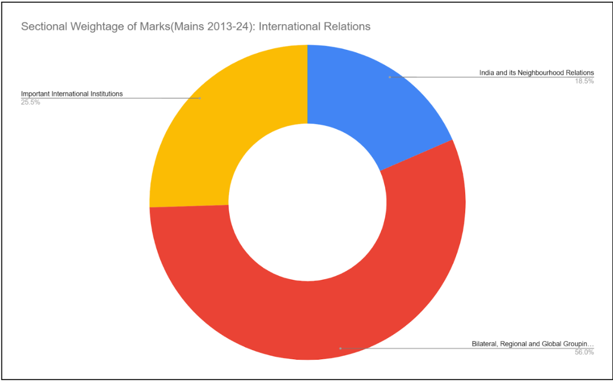 International Relations is the most dynamic part of GS Paper 2.The sectional weightage of marks for each subtopic over the past decade is presented in the figure below:
