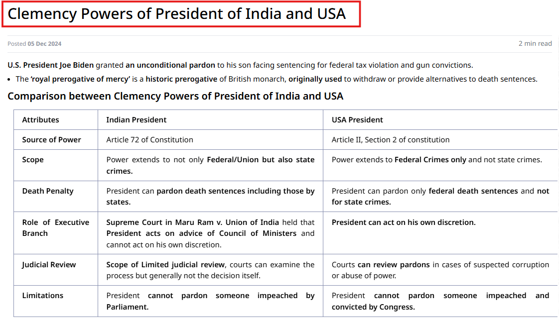 Q. Compare and contrast the President’s power to pardon in India and in the USA. Are there any limits to it in both countries? What are preemptive pardons? |