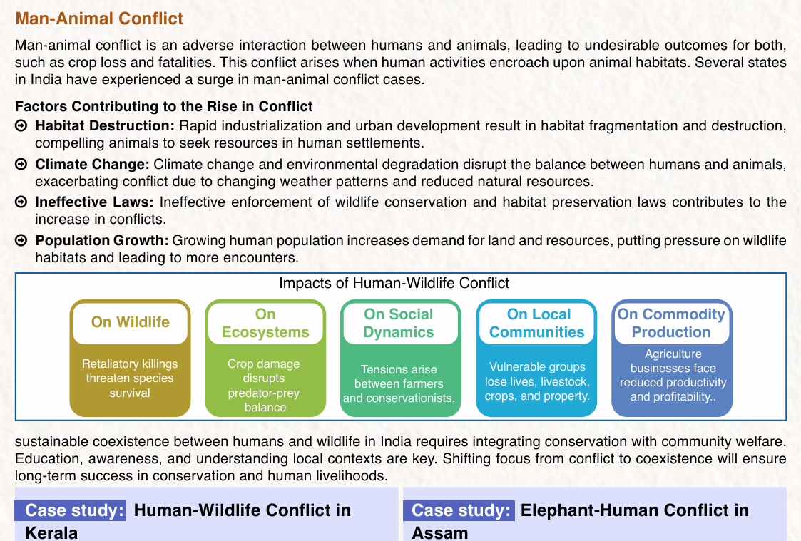 - Analytical Depth: VAM highlights impacts—species decline, ecosystem imbalance, livelihood loss, social tensions, and economic damages, with Kerala and Assam as cases.