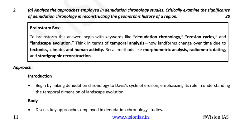 Vision IAS Geography Optional Abhyaas (Test Code-4519), Q: 2a – Analyze the approaches employed in denudation chronology studies. Critically examine the significance of denudation chronology in reconstructing the geomorphic history of a region.