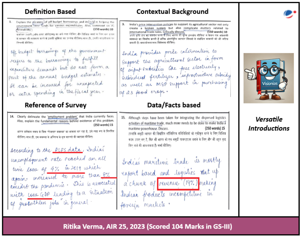Ritika Verma employed a variety of introduction strategies in her answers, including definitions, diagrams, and data from surveys. She provided contextual backgrounds and used specific examples to enrich her responses based on the demand of the questions.