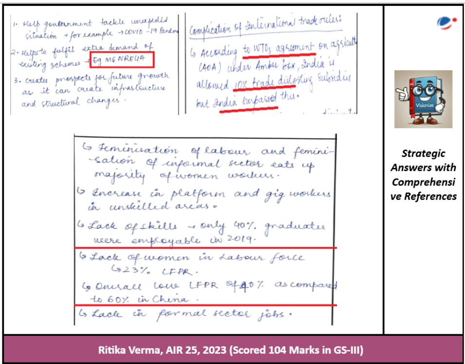 Ritika Verma’s standout feature is her use of rich content and strategic references. She adeptly incorporated government schemes, reports, surveys, key facts, references to legislation, and mentions of international organizations and their agreements, adding depth and credibility to her answers.