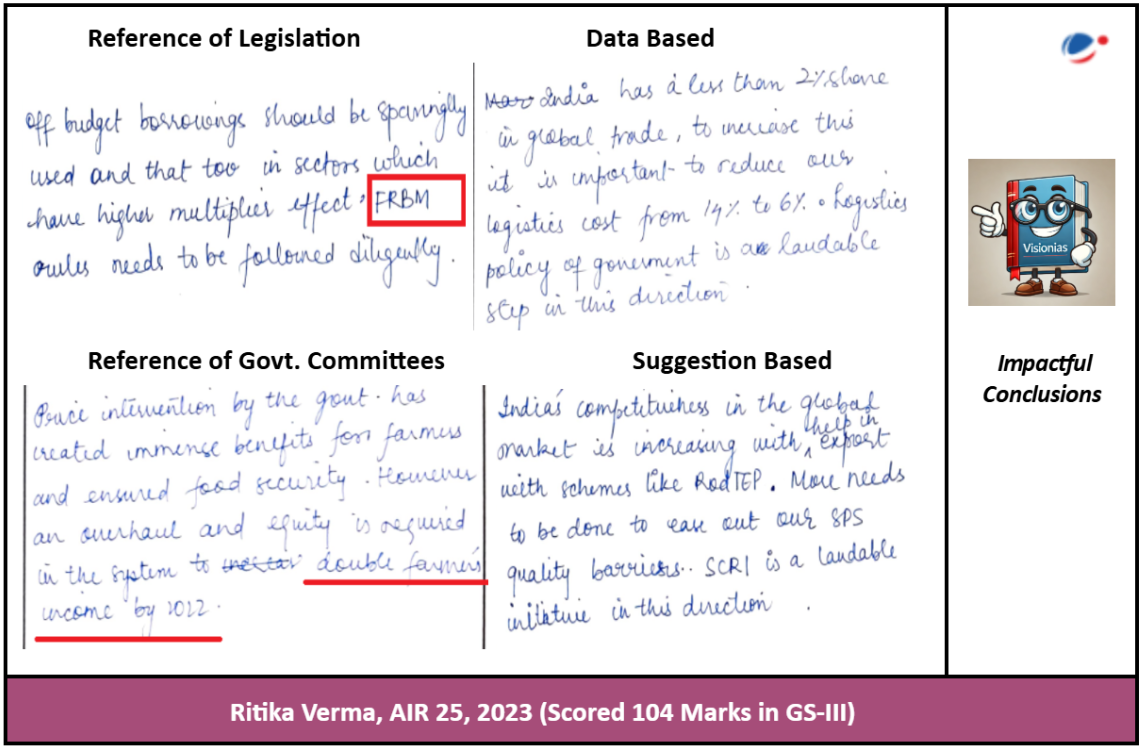 Ritika’s conclusions were thoughtfully crafted, enriched with a variety of references including government commitments, suggestions, schemes, legislation, data, and forward-looking approaches. This holistic integration ensured that her answers concluded on a strong and visionary note.