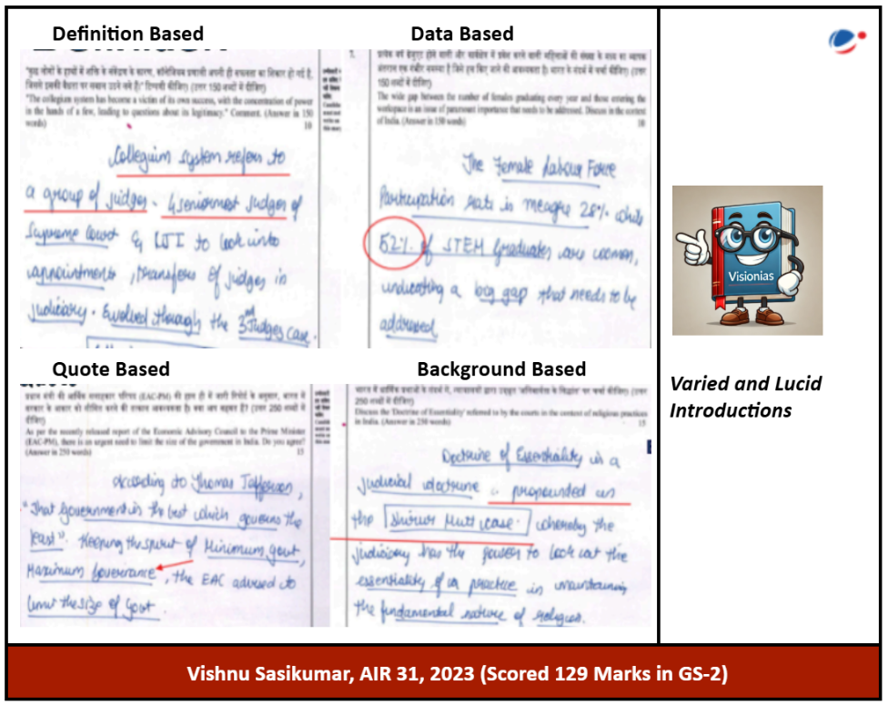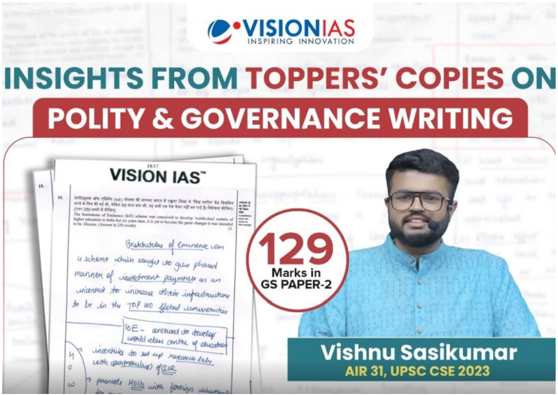 Vishnu Sasikumar, AIR-31 in UPSC 2023, exemplifies these qualities with his outstanding performance. Scoring 129 marks in GS-II, Vishnu’s answer scripts highlight his ability to combine conceptual clarity with practical insights. His balanced approach, enriched with relevant examples and structured arguments, sets a benchmark for aspirants aiming to excel in this critical paper.