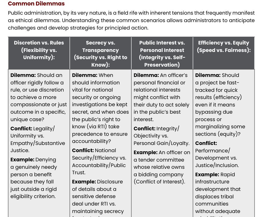 - Definition & Context : The “Ethical Dilemmas in Public Service Delivery and Administration” section of Ethics VAM discusses the shift from a “rule-based” to a “role-based” and “citizen-centric” work culture.