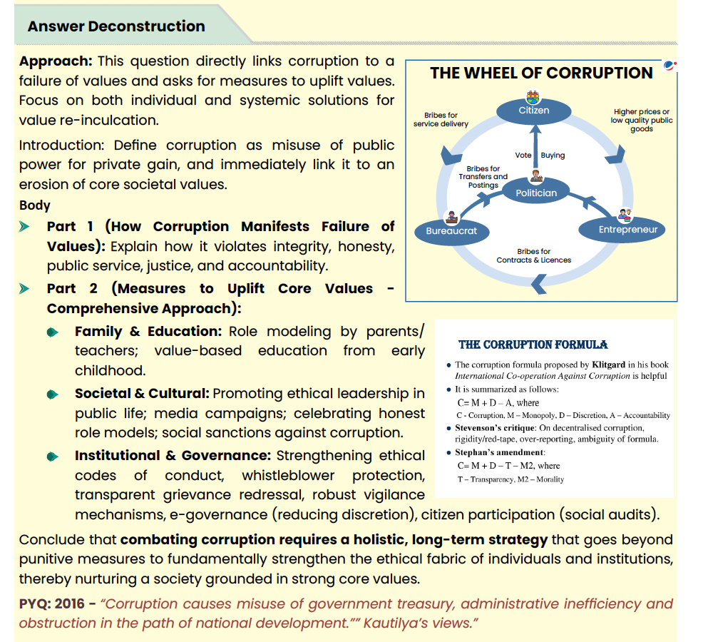 - “Measures to Uplift Core Values”: In Ethics VAM, the answer deconstruction section provides specific measures for institutions and governance, such as strengthening ethical codes, implementing whistleblower protection, and fostering transparent grievance redressal, which are directly applicable to building an ethical work culture.