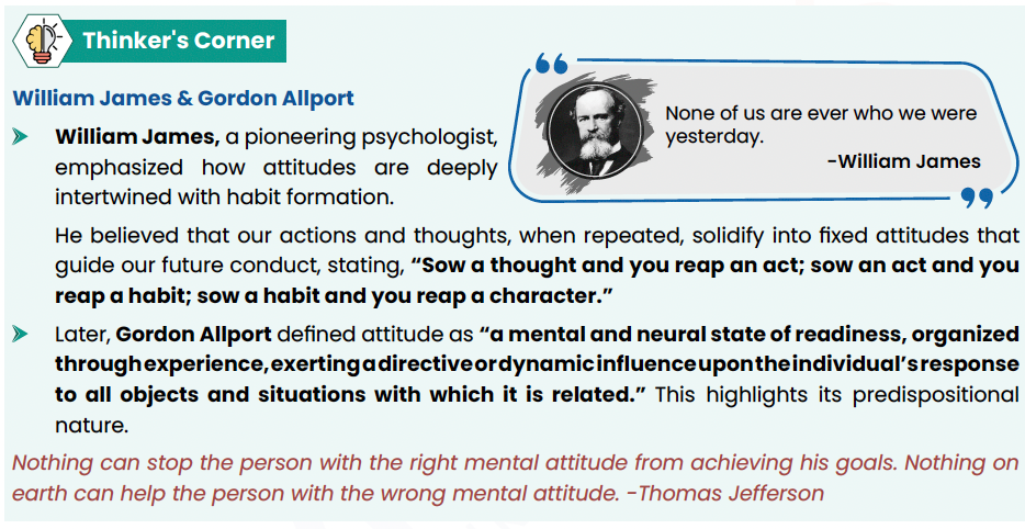 - “Thinker’s Corner”: This section directly quotes William James and connects attitudes to habit formation, explaining that repeated actions and thoughts solidify into attitudes, which in turn guide future conduct. This is the section of Ethics VAM which could help the student interpret the quote correctly.