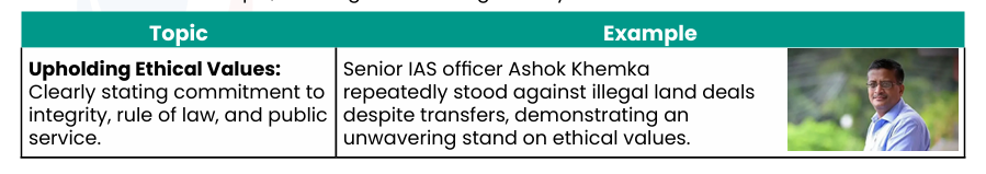 - Conclusion : While concluding Ashok Khemka Example can be used i.e. while a civil servant must be committed to social justice, they are also custodians of environmental integrity and intergenerational equity. The ideal solution is not to sacrifice one value for the other, but to find a path that protects both.