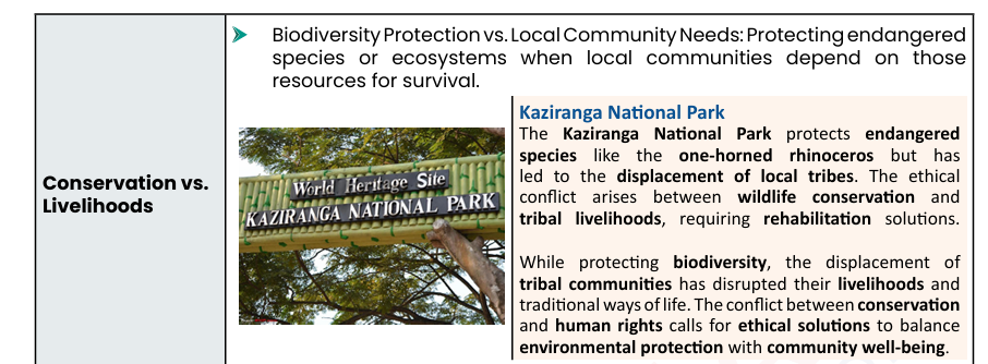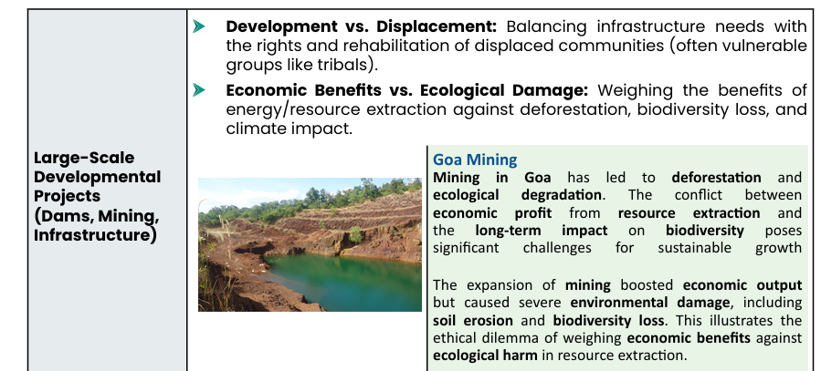 - Environmental Ethics and Sustainable Development : The document covers conflicts like Development vs. Displacement, and Economic Benefits vs. Ecological Damage. This directly addresses whether deforestation can be ethically justified for social welfare.