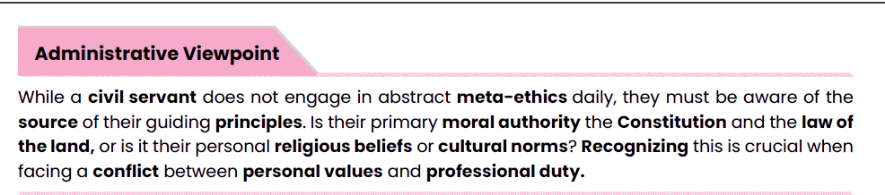 - Administrative Viewpoint: This section of the document explicitly states that a civil servant’s primary moral authority should be the Constitution, guiding them when personal values conflict with professional duty. This section directly addresses the significance for public servants.