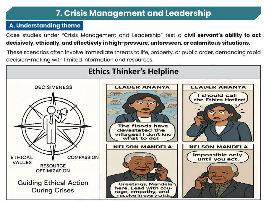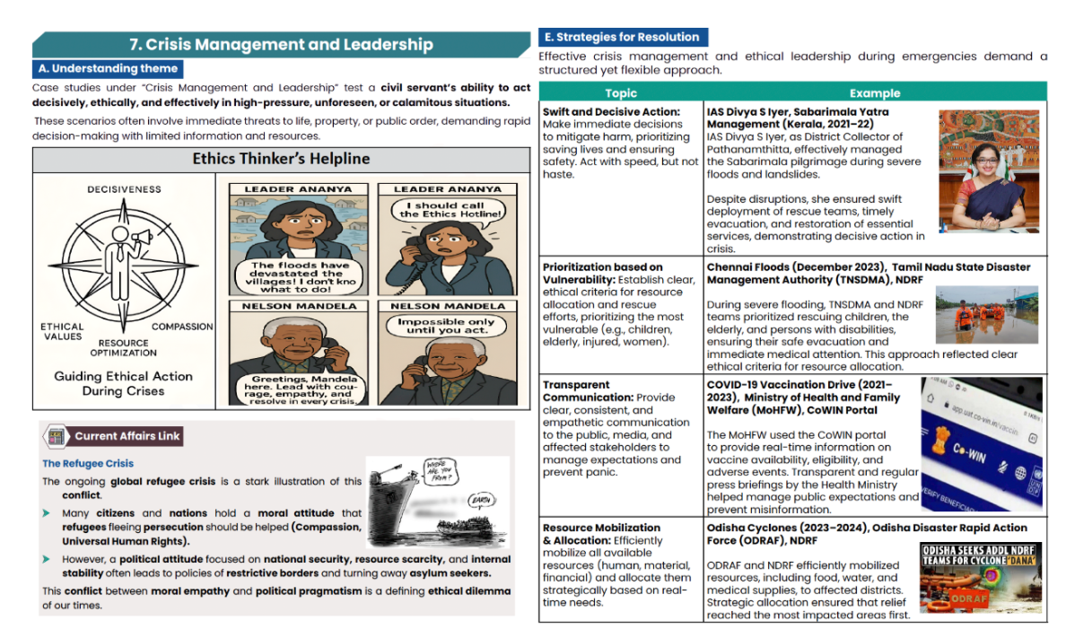 - Crisis Management and Leadership ( VisionIAS VAM Ethics Case Studies): The case directly falls under this theme. The document highlights common scenarios like natural disasters (floods, landslides) and the ethical conflicts involved, such as prioritization of lives, resource allocation, and managing public anger. This section provides a framework for identifying the core dilemmas Vijay faces: Duty to Public Service vs. Personal/Familial Duty.