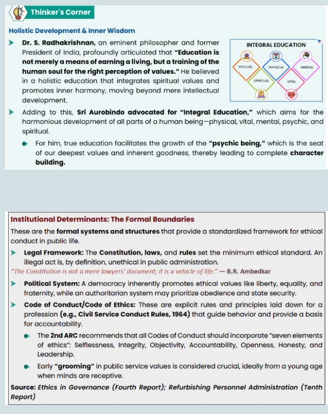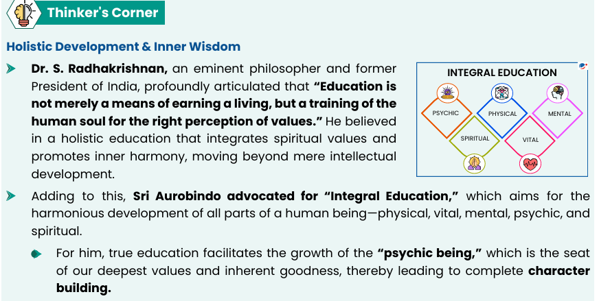 - Thinker Corner- Holistic Development: The concept is discussed in the context of “Integral Education” and examples like “Mission Karmayogi” cited which could be used for value addition