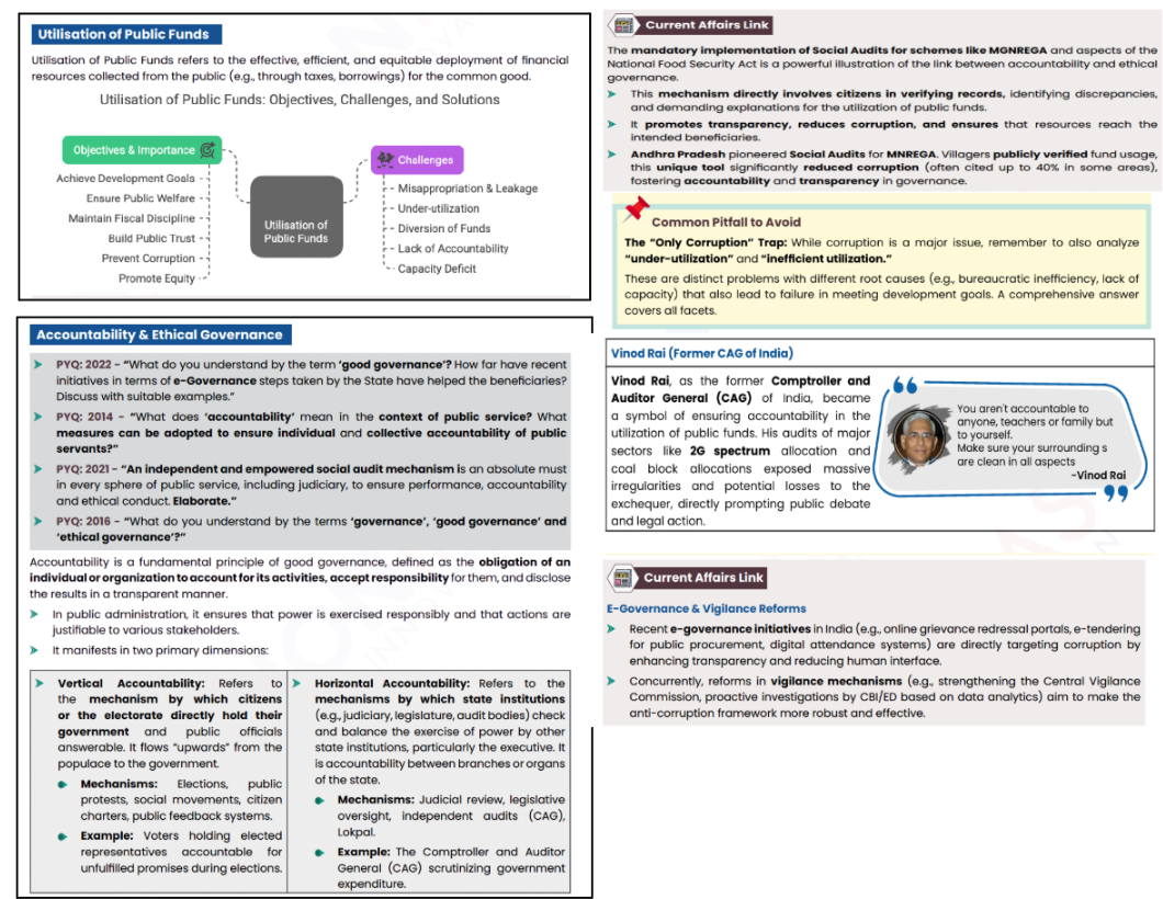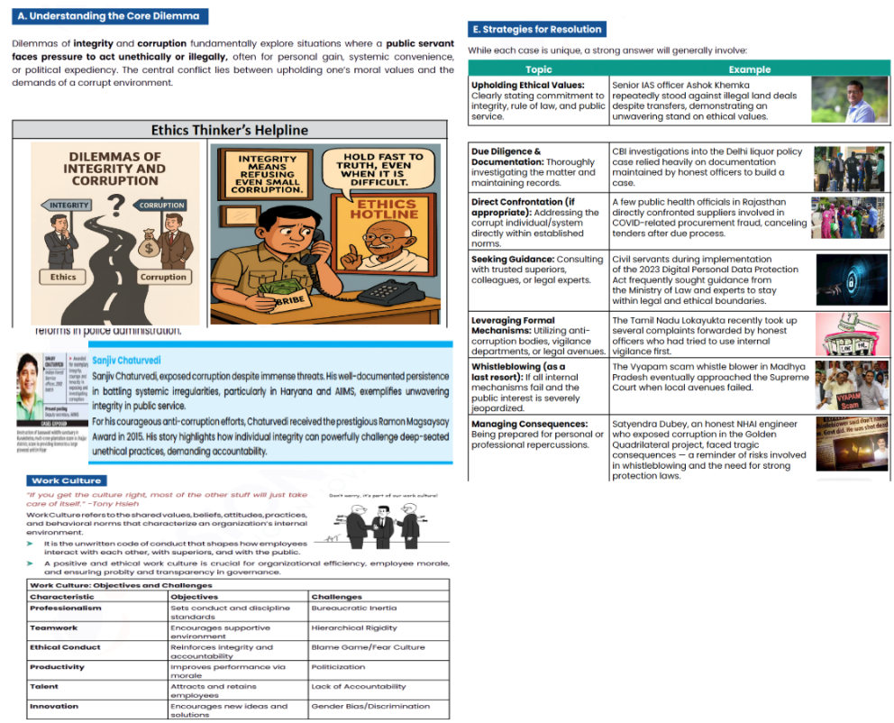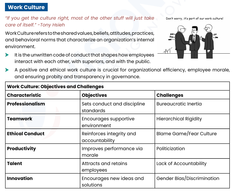- “Work Culture”: The Ethics VAM lists the objectives of a positive work culture, such as professionalism, teamwork, and ethical conduct, and discusses challenges like bureaucratic inertia and a blame-game culture. These keywords could be used as value addition in the answer.