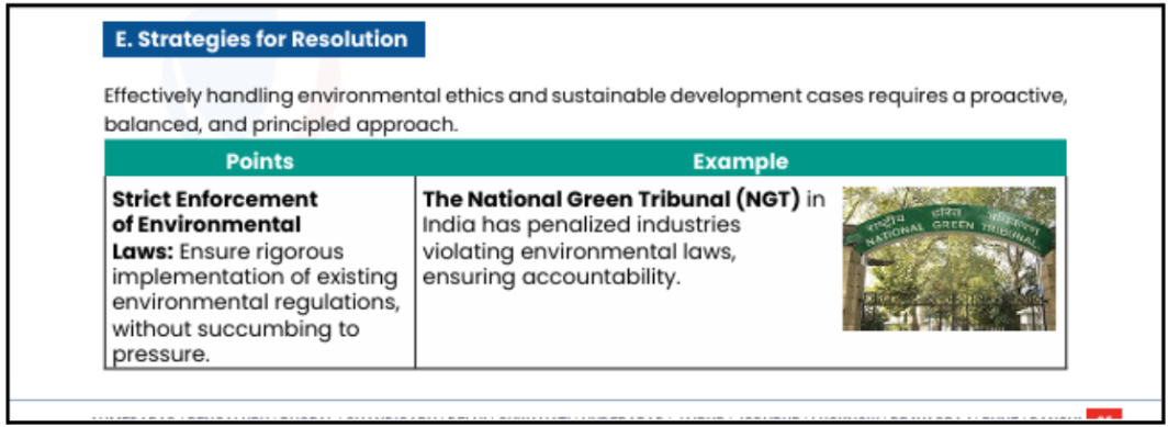 - The section on Strategies for Resolution for Environmental Ethics (VAM Ethics Case Studies) provides concrete policy interventions and alternatives which can be used to arrive at a course of action , such as promoting green technologies or conducting thorough environmental and social impact assessments.
