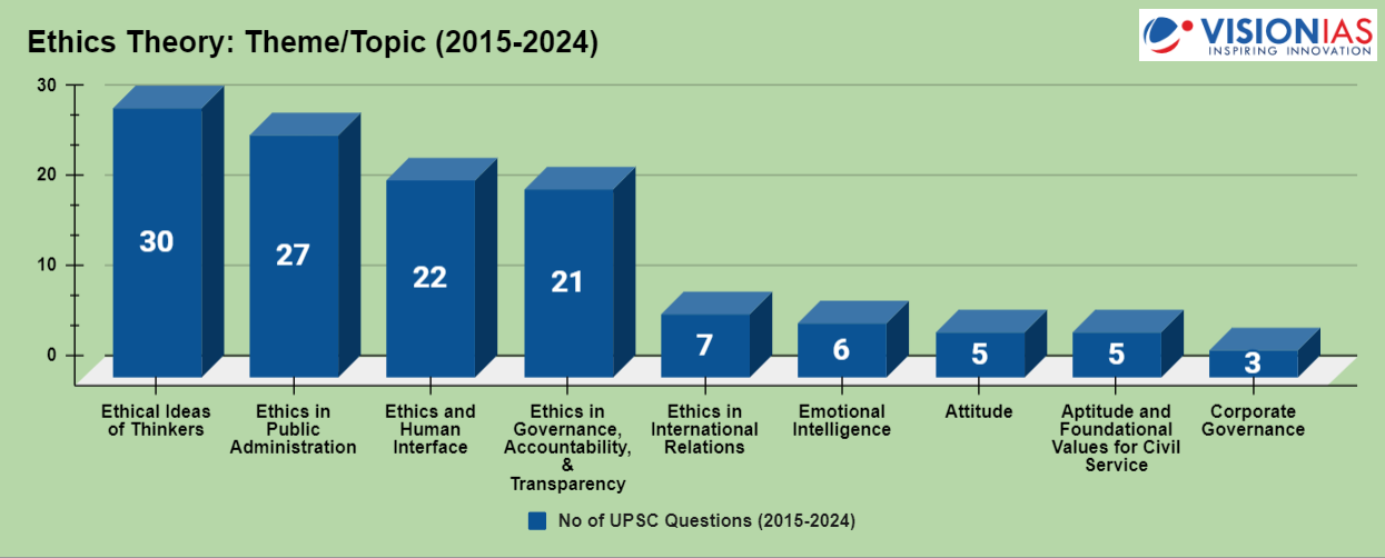The Ethics paper (GS-IV) for UPSC Mains from 2015 to 2024 reveals consistent thematic patterns, with a strong emphasis on key ethical areas. Below is a detailed breakdown of the recurring themes that have dominated the theory section over the years: