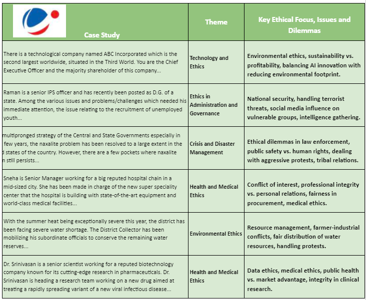 - Case studies can range from administrative ethics to environmental ethics and crisis management. Refer to the themes listed in the image you provided: