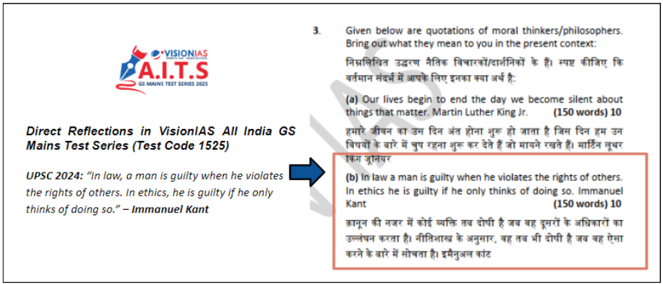 In the UPSC Mains 2024 Ethics paper, several questions were either directly or indirectly influenced by VisionIAS programs such as the All India GS Mains and Essay Test Series , Abhyaas Mains, Lakshya Mains Mentoring Program, and Daksha Mains Mentoring Program. This highlights the significant relevance and effectiveness of these practice-oriented initiatives, which play a crucial role in preparing aspirants for the UPSC Mains exam.