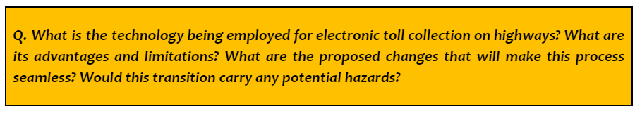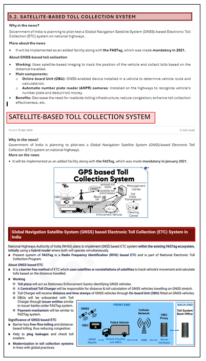 This question can be answered using information from the Mains 365 Satellite-Based Collection System, Monthly article on Satellite-Based Collection Systems and News Today on Global Navigation Satellite System (GNSS) based Electronic Toll Collection (ETC) System in India.